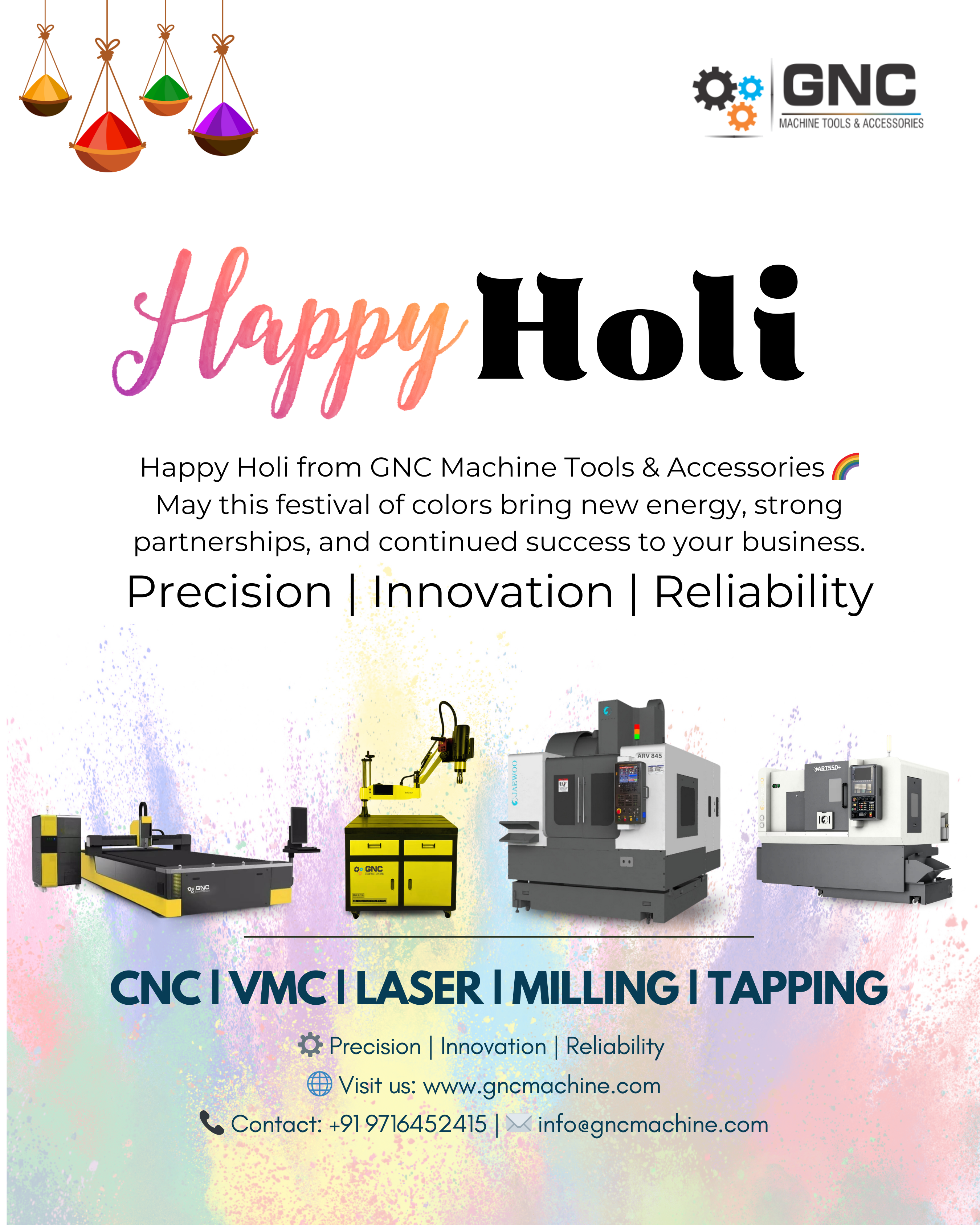 #HappyHoli #Holi2026 #GNCMachineTools #CNCMachine #VMC #LaserMachine #MillingMachine #TappingMachine #MachineTools #IndustrialSolutions #ManufacturingIndia #MakeInIndia #PrecisionEngineering #BusinessGrowth #FestivalOfColors